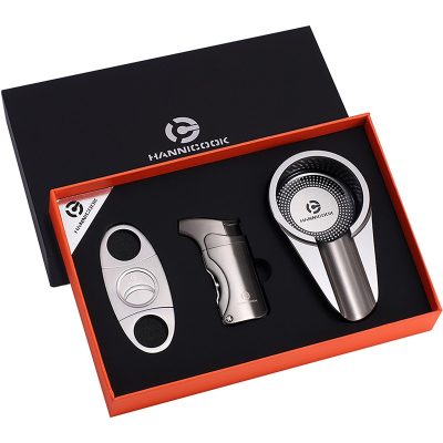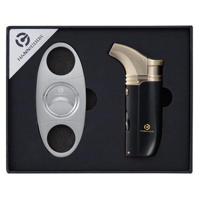 Hannicook gift set 659-003 je elegantan i praktičan poklon set za ljubitelje cigara, idealan za kućnu upotrebu ili kao poklon. Set sadrži sekač od nerđajućeg čelika za precizno sečenje, upaljač od legure cinka sa 4 jet plamena za brzo i ravnomerno paljenje, kao i keramičku pepeljaru koja upotpunjuje komplet.