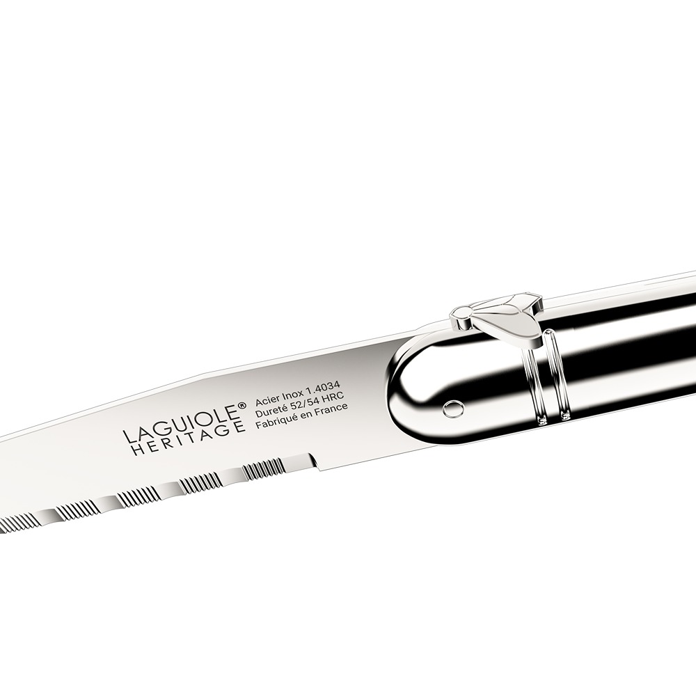 Laguiole Heritage noževi odlikuju se izdržljivošću, stabilnim hvatom i sofisticiranim izgledom, zbog čega su odličan izbor za ljubitelje kvalitetnog escajga. Metalna drška doprinosi modernom i elegantnom izgledu, dok nazubljeno sečivo omogućava efikasno sečenje različitih vrsta mesa.