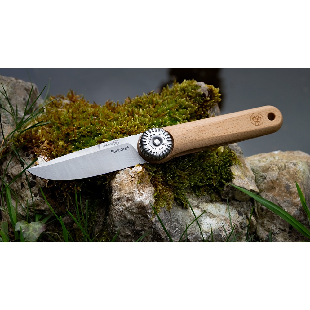 Sečivo je izrađeno od nerđajućeg čelika X46Cr13, koji pruža dobru otpornost na koroziju i lako održavanje. Drška od francuske bukovine doprinosi prijatnom osećaju u ruci i daje nožu prirodan, elegantan izgled. Sa težinom od oko 62 g, TB Suricate je dovoljno lagan za svakodnevno nošenje u džepu ili rancu.