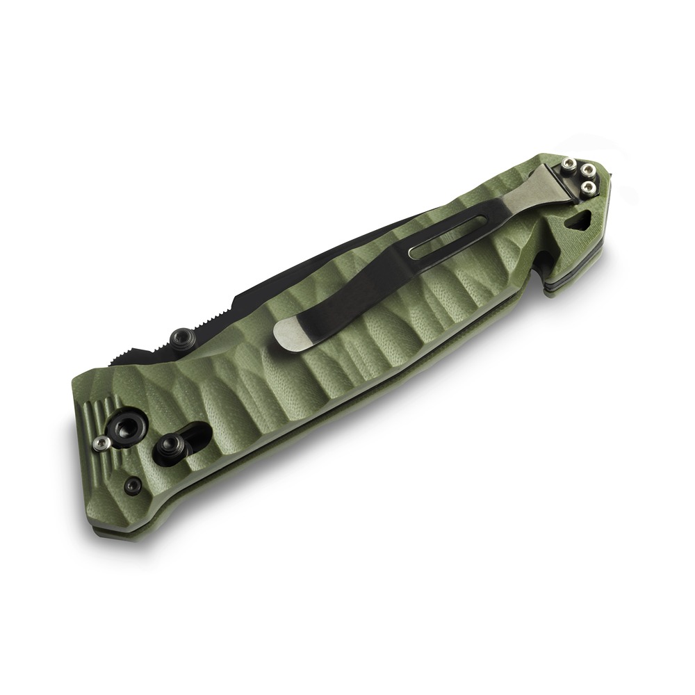 Za bezbednost pri radu zadužen je snažan bar lock mehanizam kočenja, koji pruža čvrsto zaključavanje sečiva tokom upotrebe. Reverzibilna džepna kopča i konstrukcija pogodna za levoruke i dešnjake čine ovaj model veoma praktičnim za svakodnevno nošenje.